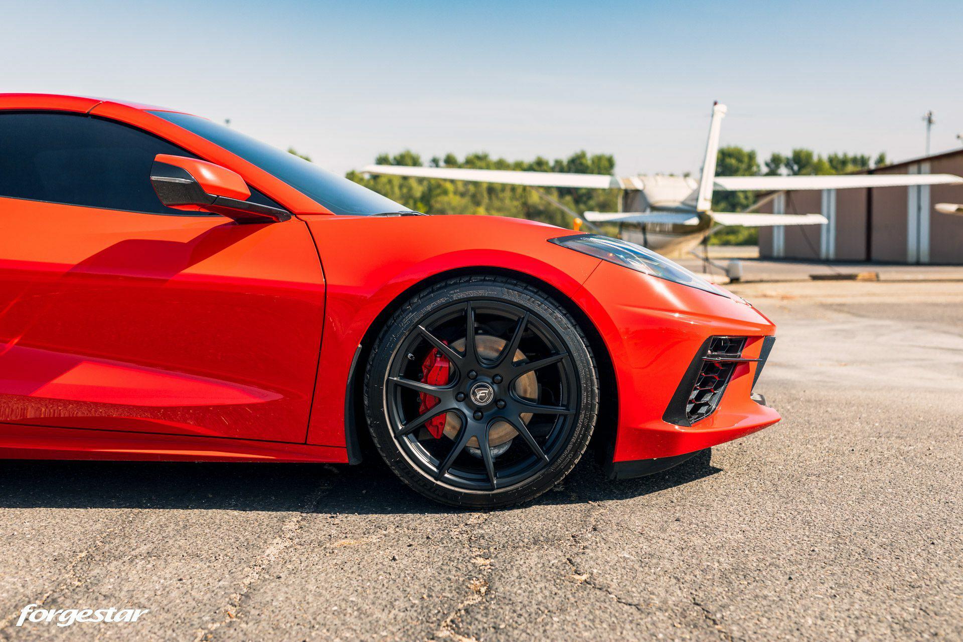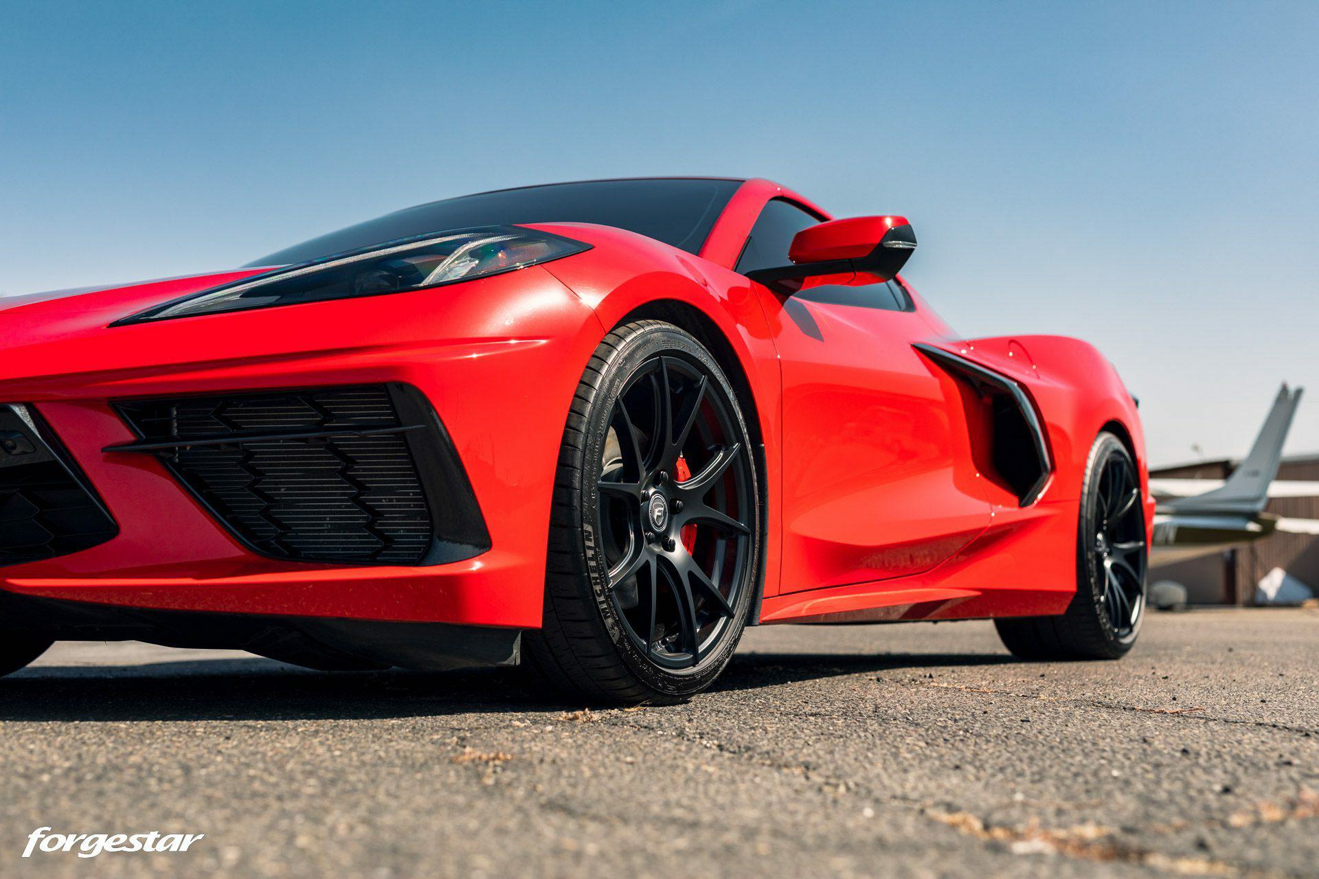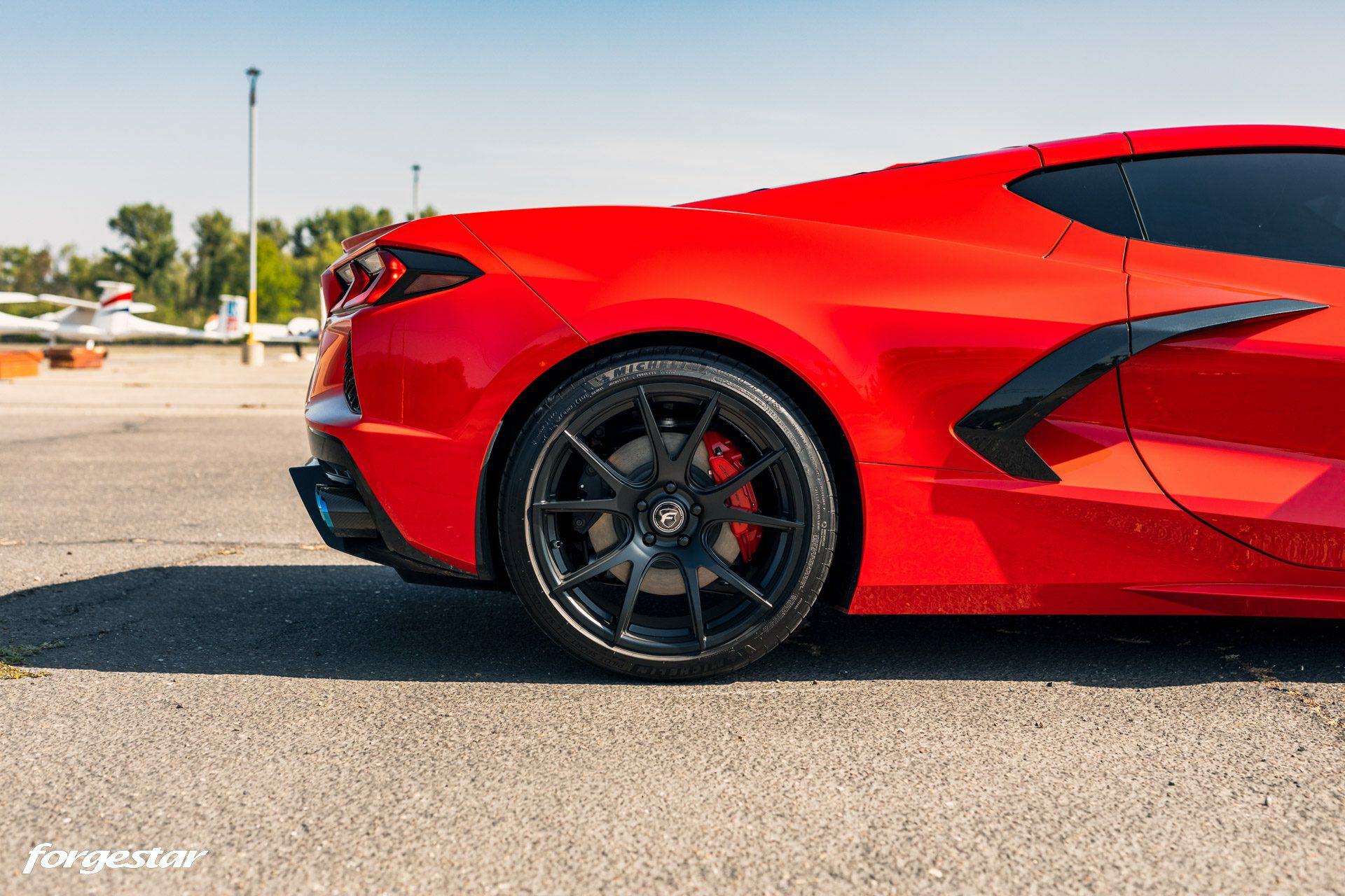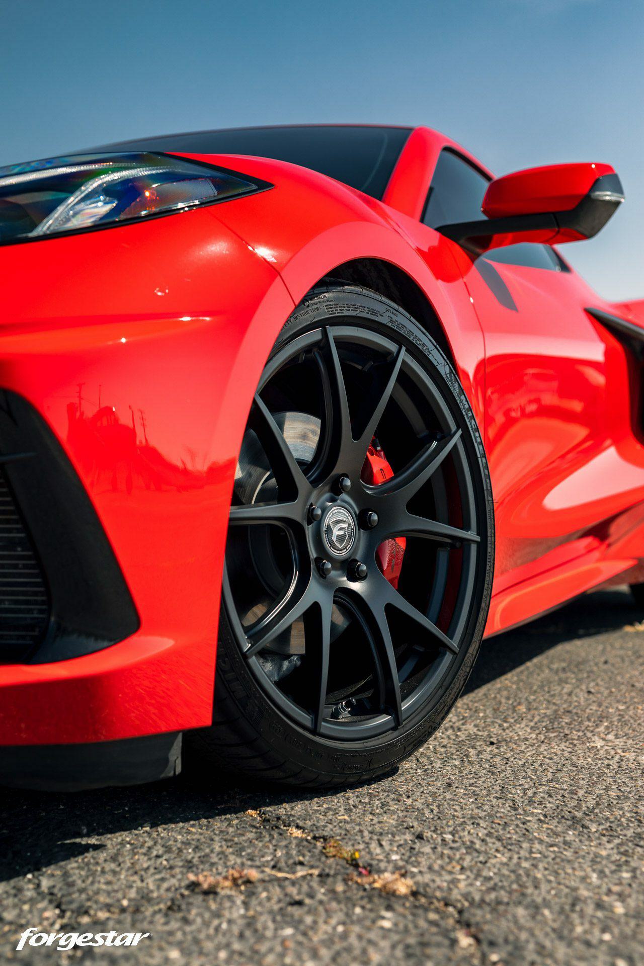 Another Torch Red Chevrolet Corvette C8, this time showcasing a set of lightweight Forgestar CF5V rotary-formed wheels, sized 19x9 in the front and 20x12 in the rear, adorned with a Satin Black finish