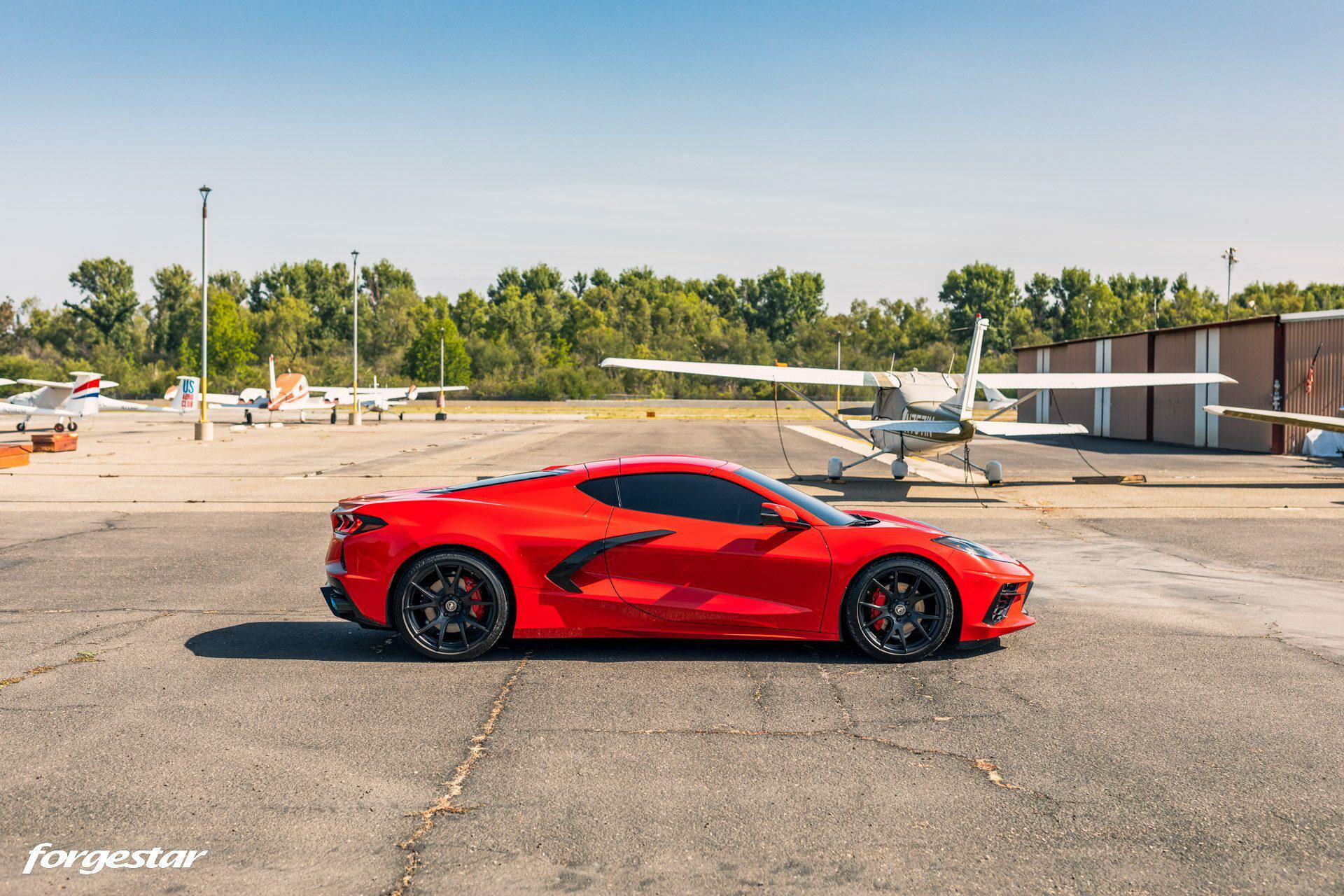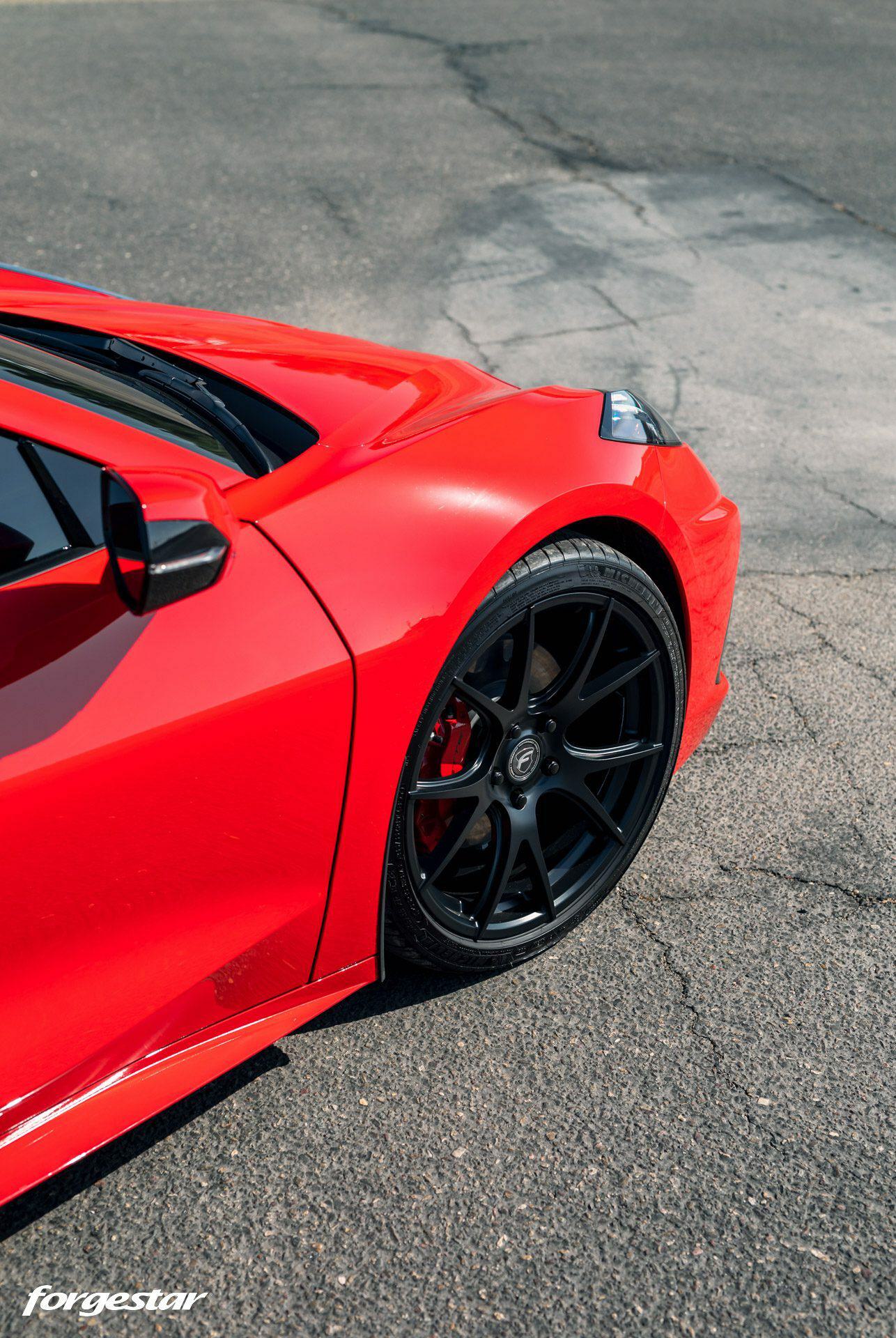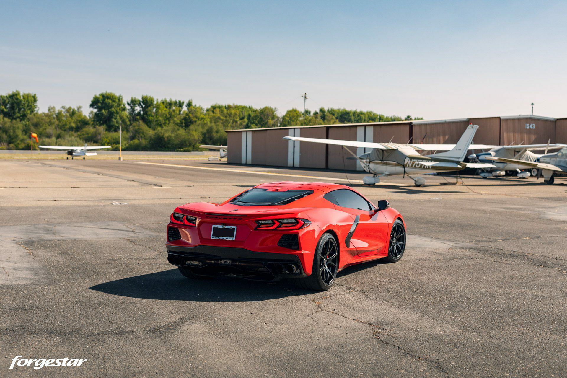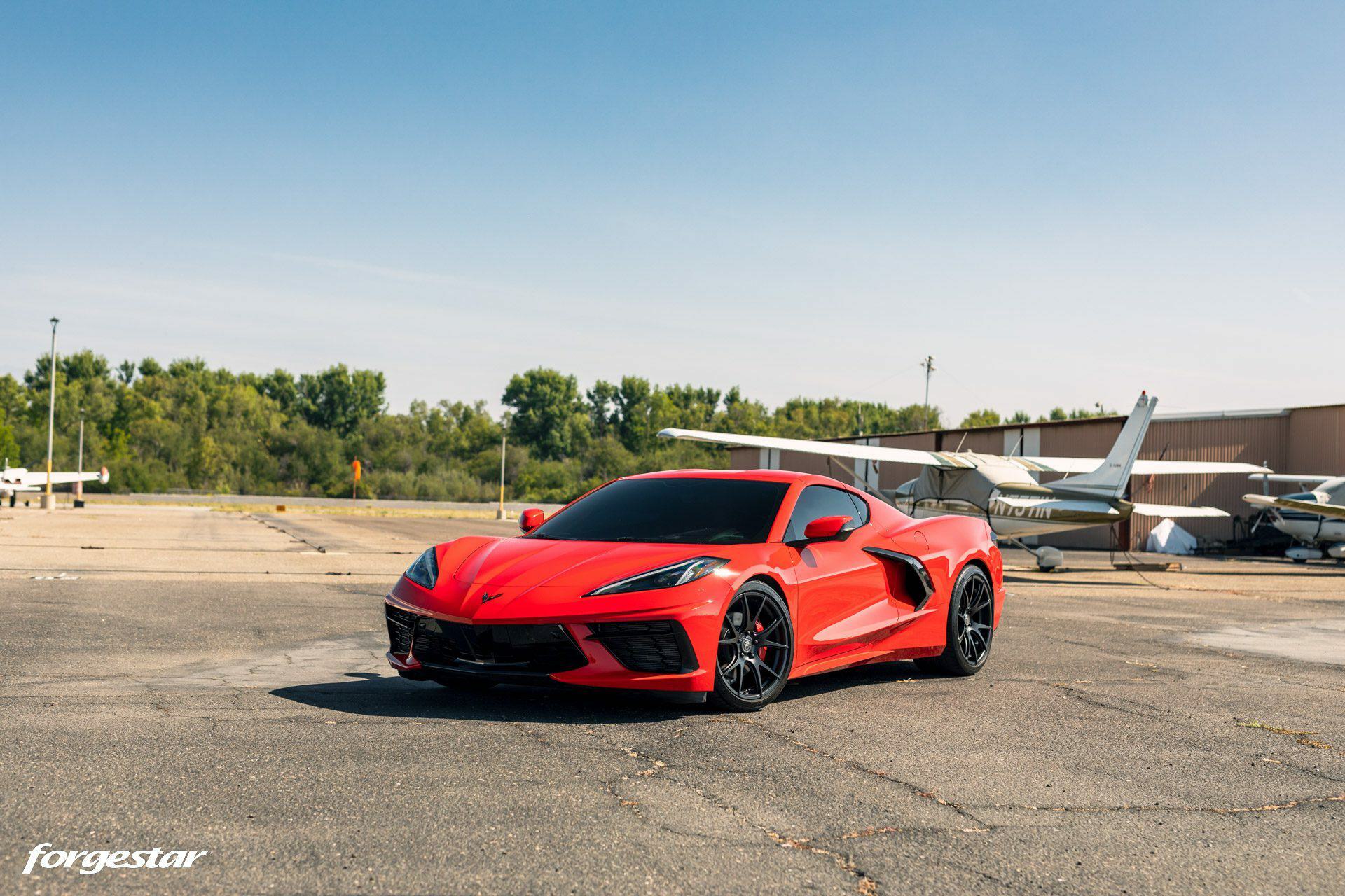 Another Torch Red Chevrolet Corvette C8, this time showcasing a set of lightweight Forgestar CF5V rotary-formed wheels, sized 19x9 in the front and 20x12 in the rear, adorned with a Satin Black finish